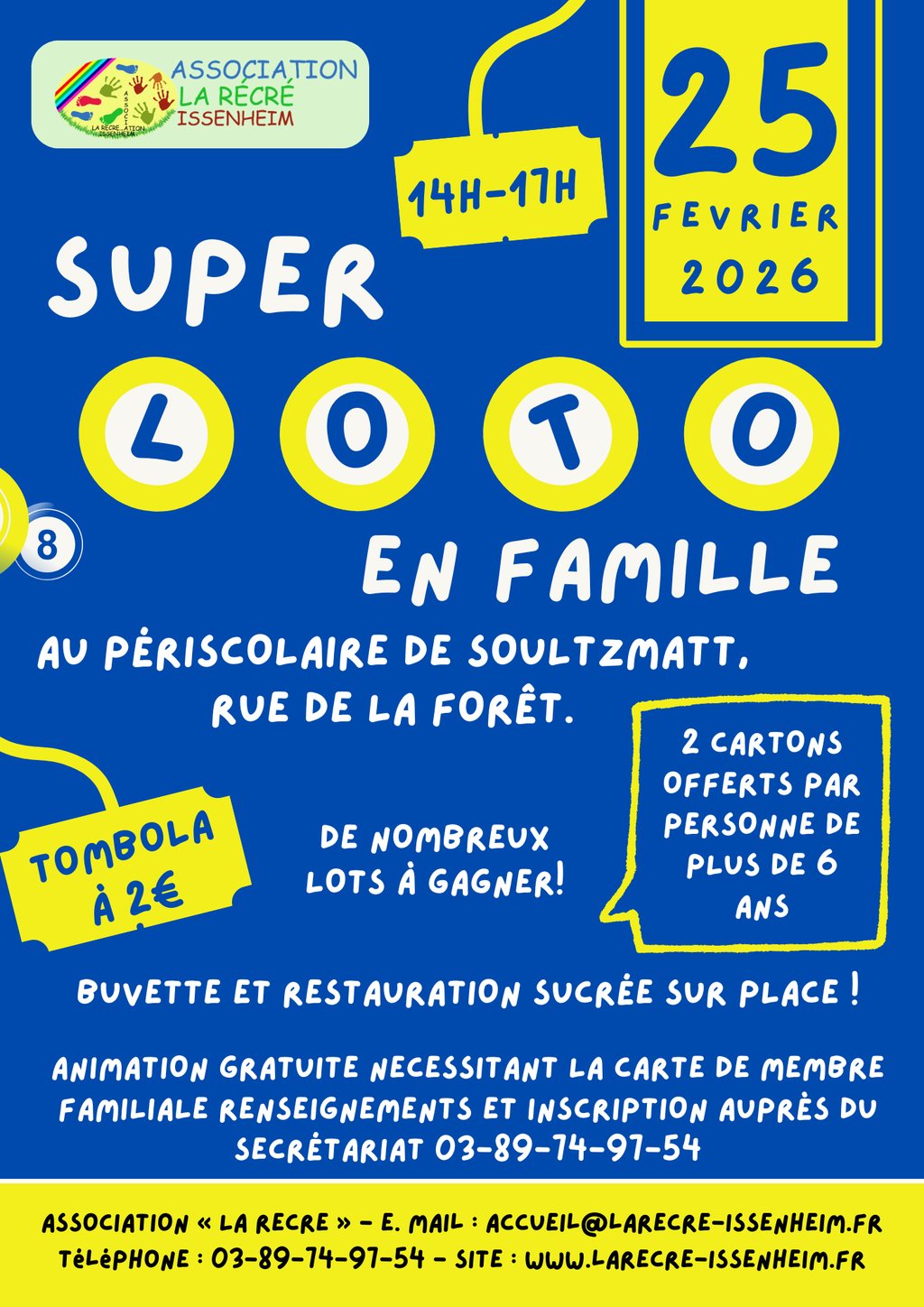 L’association La Récré organise un super loto en famille le mercredi 25 février de 14 h à 17 h au périscolaire de Soultzmatt, Rue de la Forêt.