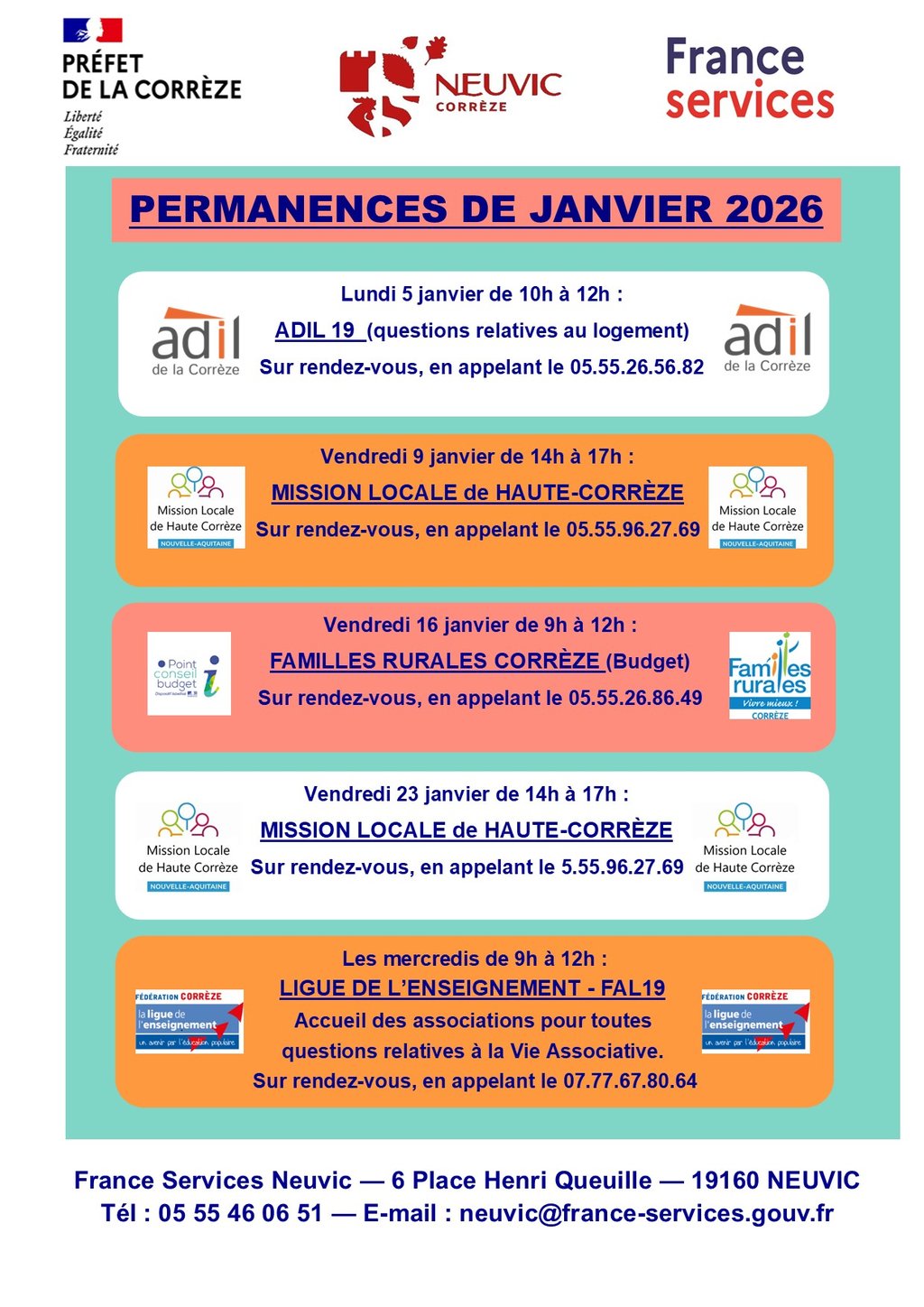 Maison France Services à NEUVIC - planning des permanences du mois de janvier 2026