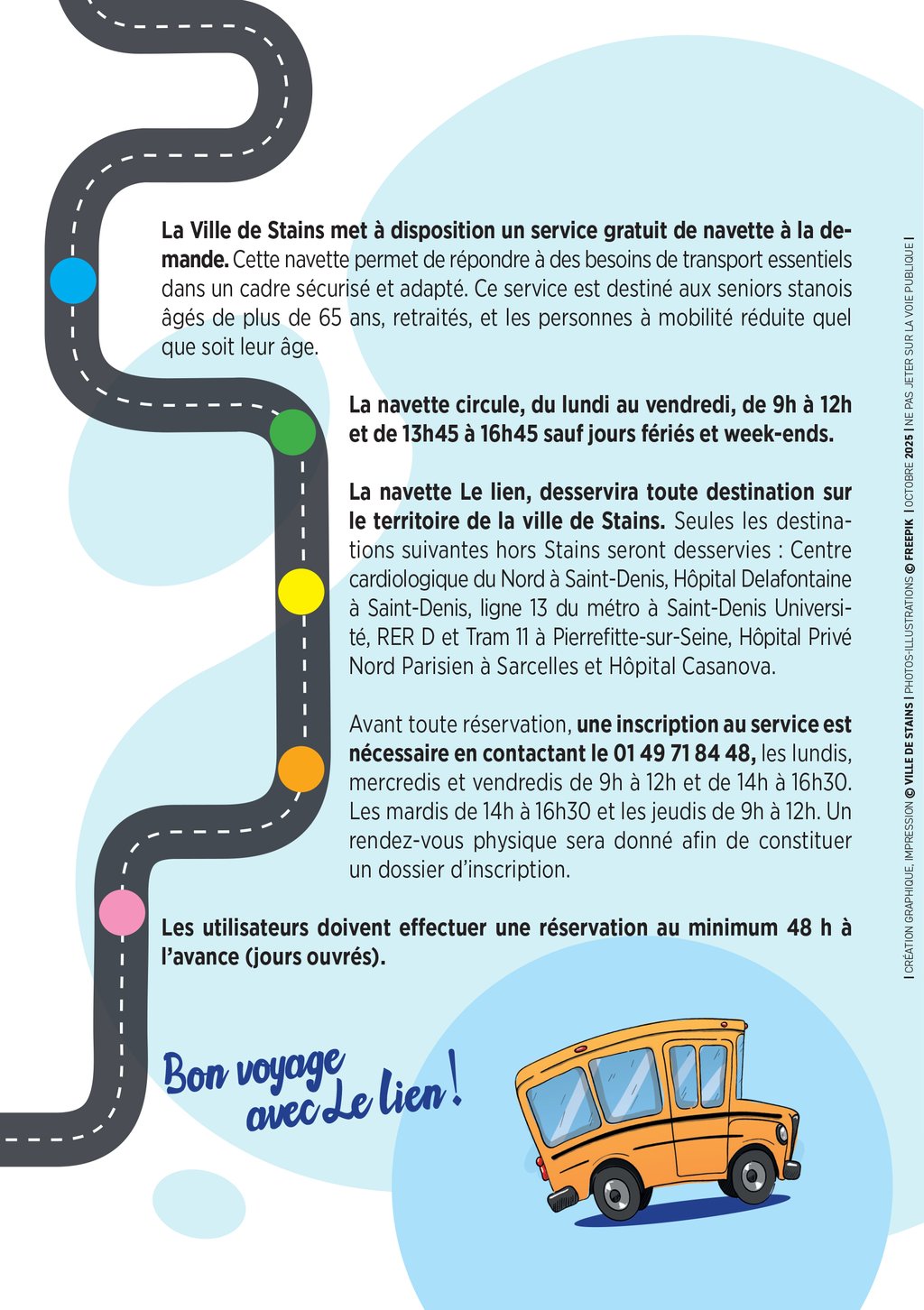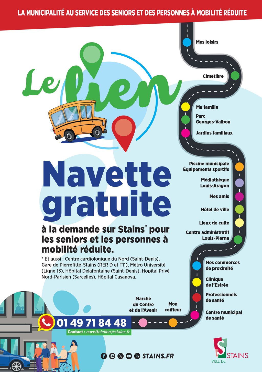 Afin de faciliter les déplacements des Stanois les plus vulnérables, la Ville de Stains met à disposition « Le Lien », une navette gratuite à la demande dédiée aux seniors de plus de 65 ans, retraités et personnes à mobilité réduite, quel que soit leur âge.