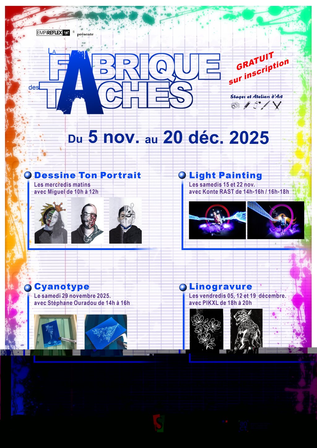 En effet, à partir du 5 novembre et jusqu’au 20 décembre, La Fabrique des taches 2e édition lance son premier cycle de stages et d’ateliers d’art à la galerie Taches d’art. Quatre pratiques sont proposées gratuitement sur inscription.