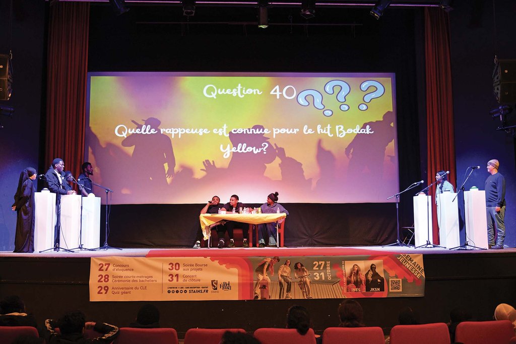 Sur scène, les grands buzzers étaient prêts et l’ambiance électrique : 12 équipes de 12 participants issues de structures stanoises comme l’APCIS, la Sauvegarde 93, la Maison pour Tous Yamina Setti, la Structure Information Jeunesse ou encore le Conseil Consultatif de la Jeunesse se sont affrontées dans un grand jeu de culture générale mêlant rapidité, réflexion et esprit d’équipe.