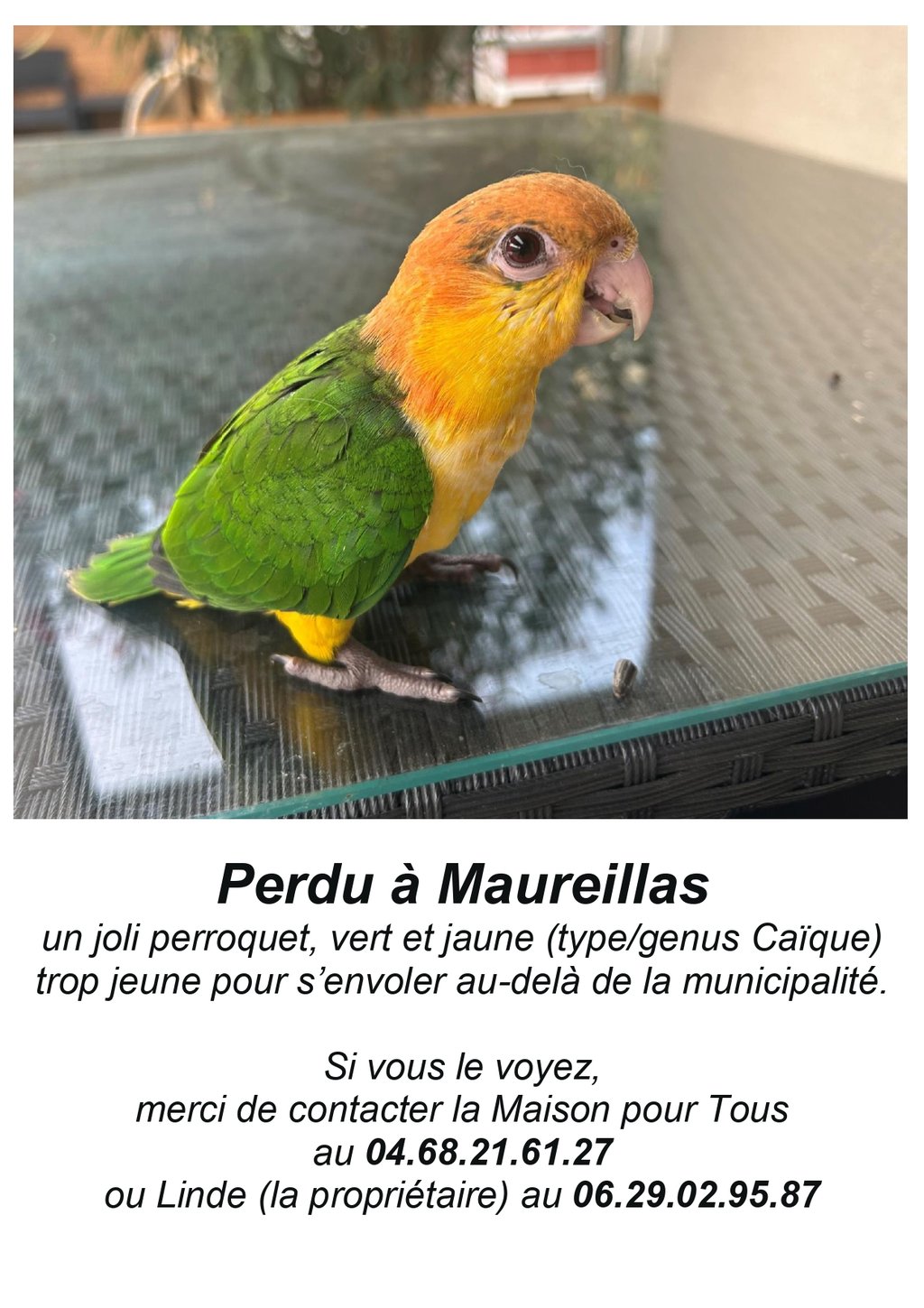 un joli perroquet, vert et jaune (type/genus Caïque)