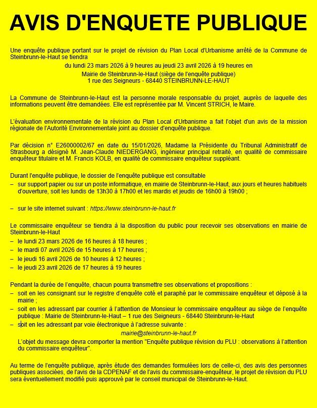 Une enquête publique portant sur le projet de révision du Plan Local d'Urbanisme arrêté de la Commune de Steinbrunn-le-Haut se tiendra du lundi 23 mars 2026 à 9 heures au jeudi 23 avril 2026 à 19 heures en Mairie de Steinbrunn-le-Haut (siège de l'enquête publique)