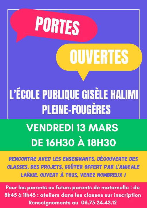 L’École publique Gisèle Halimi vous ouvre ses portes vendredi 13 mars de 16h30 à 18h30.
