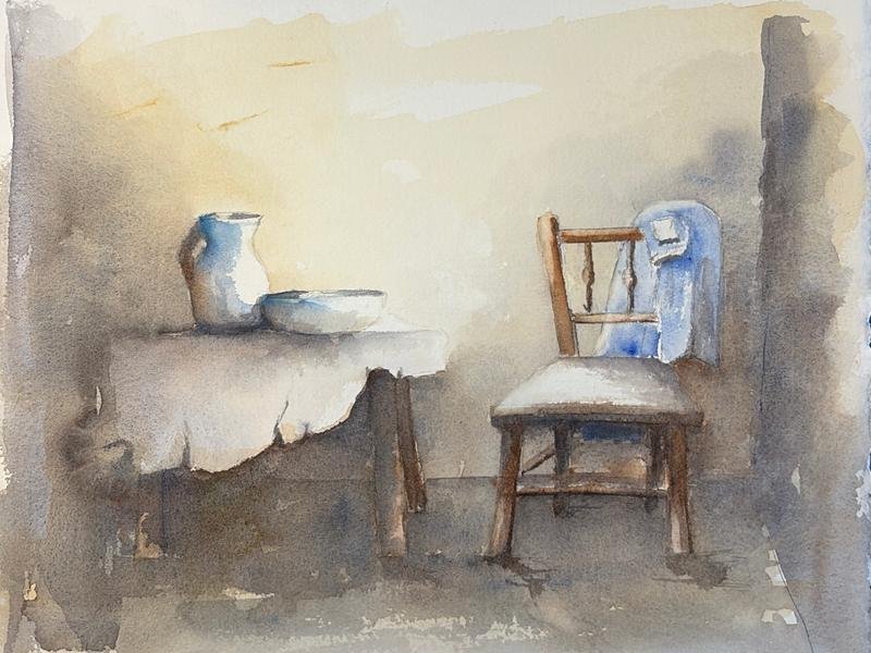 Tombée amoureuse de l'aquarelle pour sa fluidité, ses fusions et sa transparence, sa conversation avec elle invite l'artiste à oublier tout le reste. C'est sa méditation, son évasion de la journée. Elle ne fait plus qu'un avec elle.
