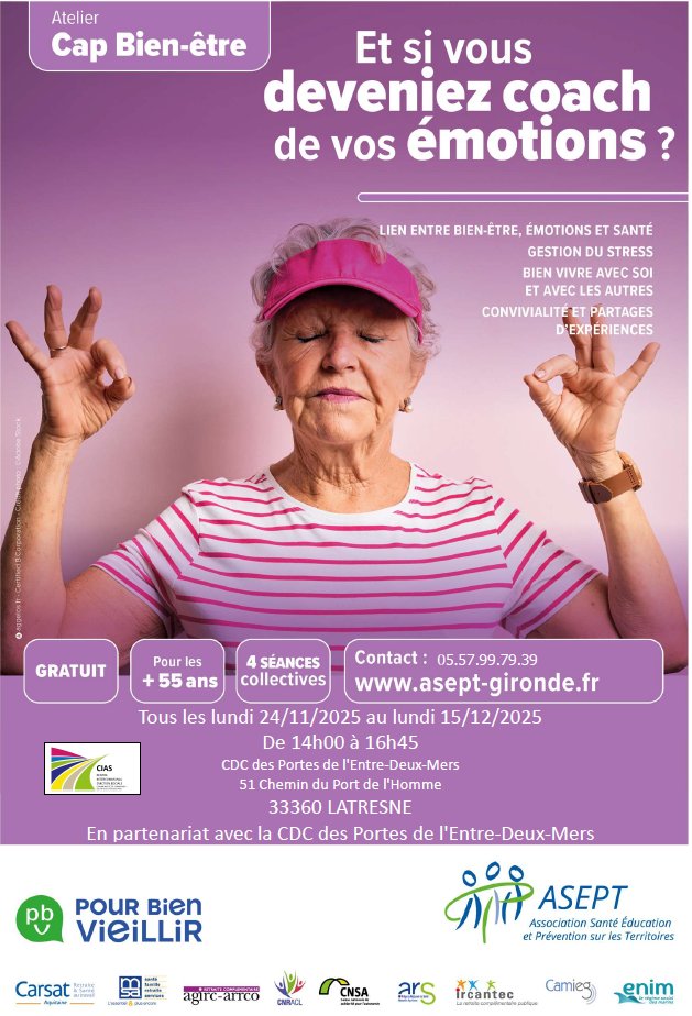 📢 L’association ASEPT, en partenariat avec le CIAS des Portes de l'Entre-deux-Mers, vous propose un Atelier CAP Bien-être à destination des séniors à partir de 55 ans.