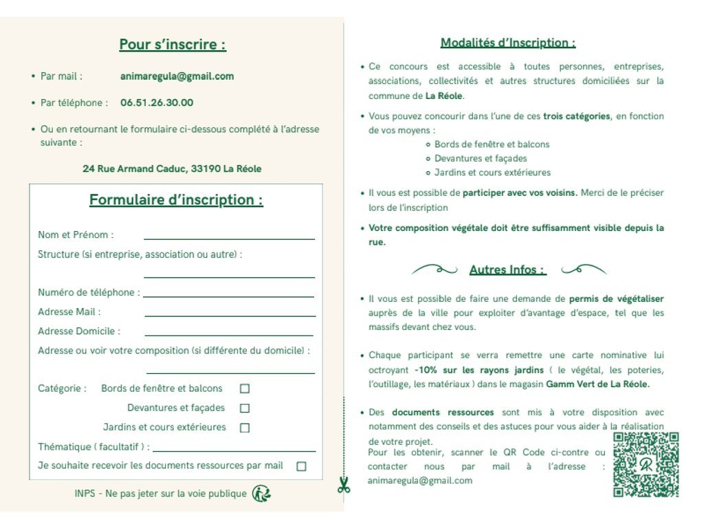 Le Collectif Anima Regula est heureux de vous inviter à participer à son tout premier concours de végétalisation des façades. La nature est belle, n’est-ce pas ? Alors, cultivons-la et épanouissons-nous avec elle. Déroulement du concours : fin des inscriptions le 15 mai 2026 et fin du concours 15 juin 2026 avec prise en photo des compositions. Une exposition photo sera organisée afin de mettre en avant le travail des participants et permettre à chacun de voter pour sa composition préférée. Un parcours fleuri sera créé dans la ville pour admirer chaque création. Le 15 juillet 2026 : délibération du jury et annonce des résultats. Tout au long de l’année, divers ateliers seront organisés dans le cadre du concours, ainsi que des ventes et des trocs de plantes.