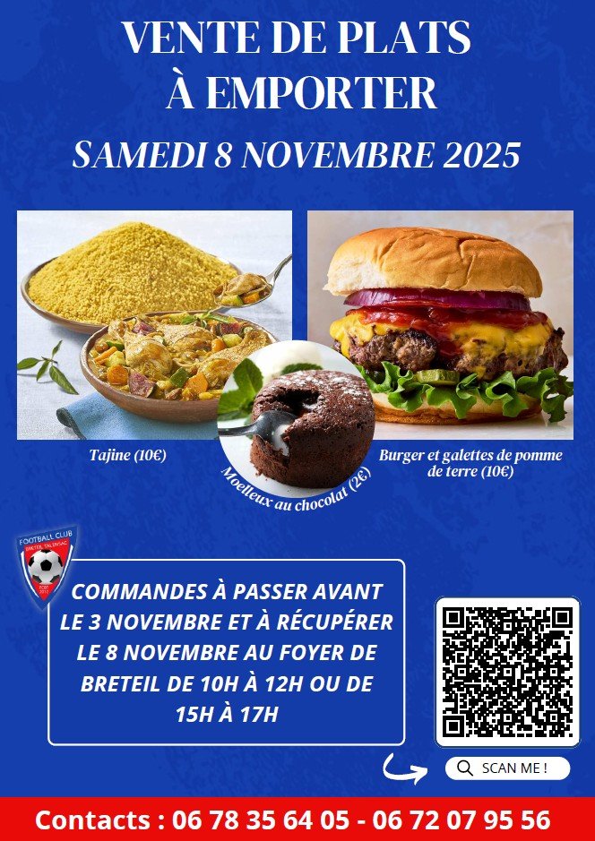 Le Football Club de Breteil-Talensac (FCBT) organise une vente de plats à emporter le samedi 8 novembre 2025 au foyer de Breteil.