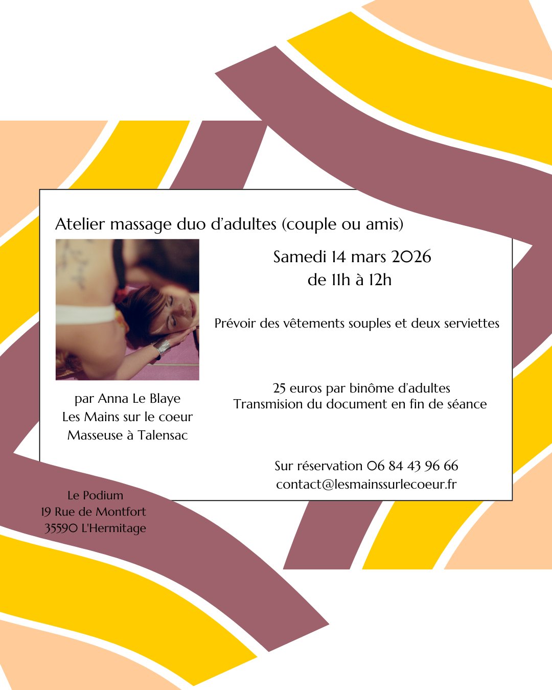 ATELIER MASSAGE DUO D'ADULTES, SAMEDI 14 MARS DE 11H À 12H