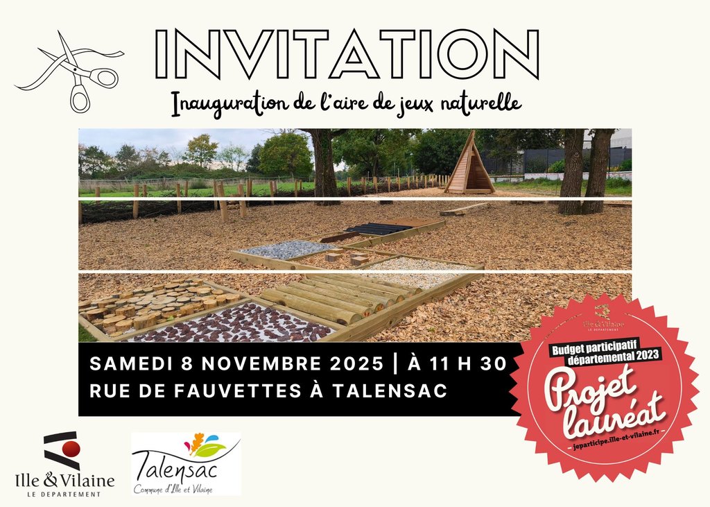 La commune de Talensac invite les habitants à découvrir la nouvelle aire de jeux naturelle pour enfants, le samedi 8 novembre à 11h30, rue des Fauvettes.