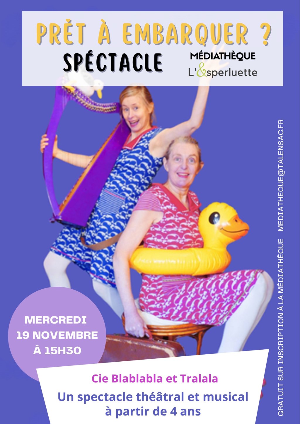 La médiathèque L’Esperluette vous invite à découvrir le spectacle familial « Prêt à embarquer » le mercredi 19 novembre à 15h30. Destiné aux enfants à partir de 4 ans, ce spectacle mêle théâtre et musique pour offrir un moment de divertissement et d’éveil.
