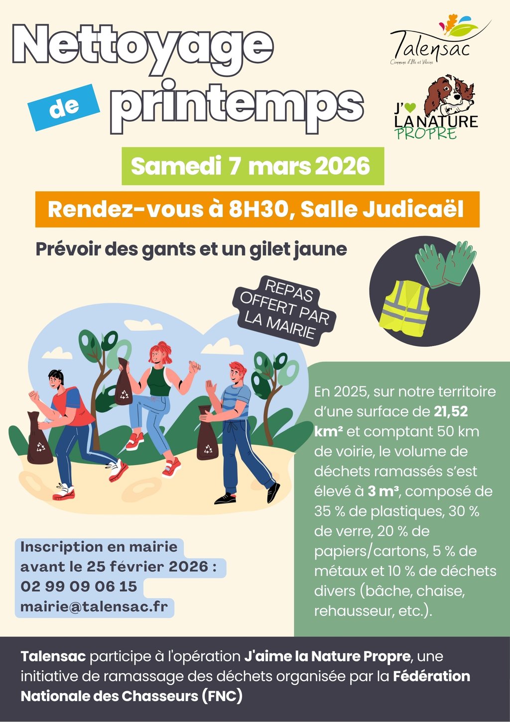La commune de Talensac participe à l’opération « J’aime la Nature Propre », organisée par la Fédération Nationale des Chasseurs (FNC). Cette initiative vise à sensibiliser chacun à la propreté de notre environnement et à collecter les déchets sur le territoire.