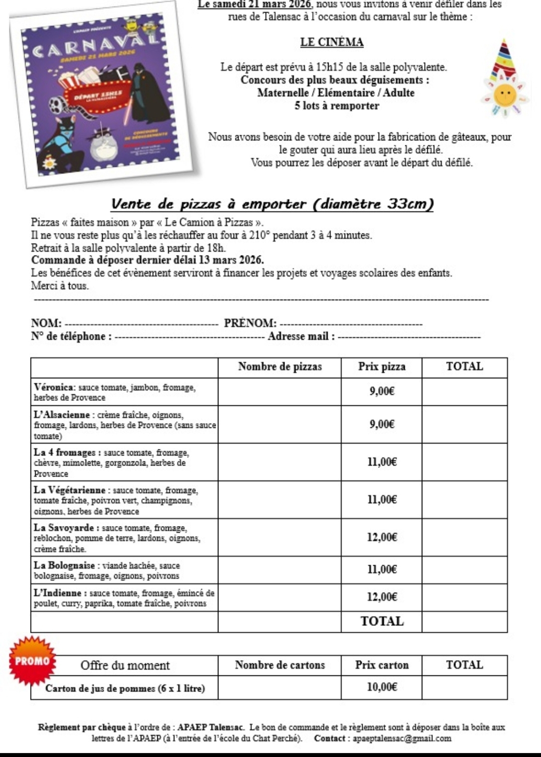 Les commandes de pizzas seront a récupérer à partir de 18 h 30 à la salle polyvalente de Talensac.
