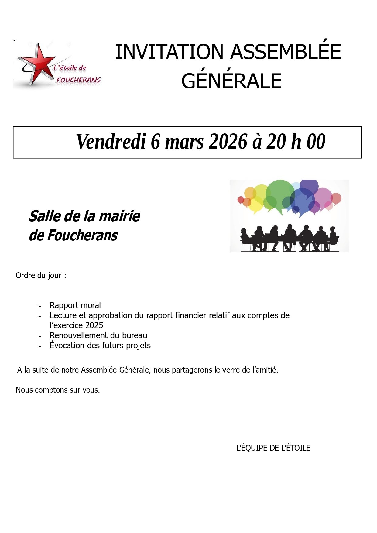L’Étoile de Foucherans, vous convie à son AG, le vendredi 6 mars 2026 à 20 h 00.