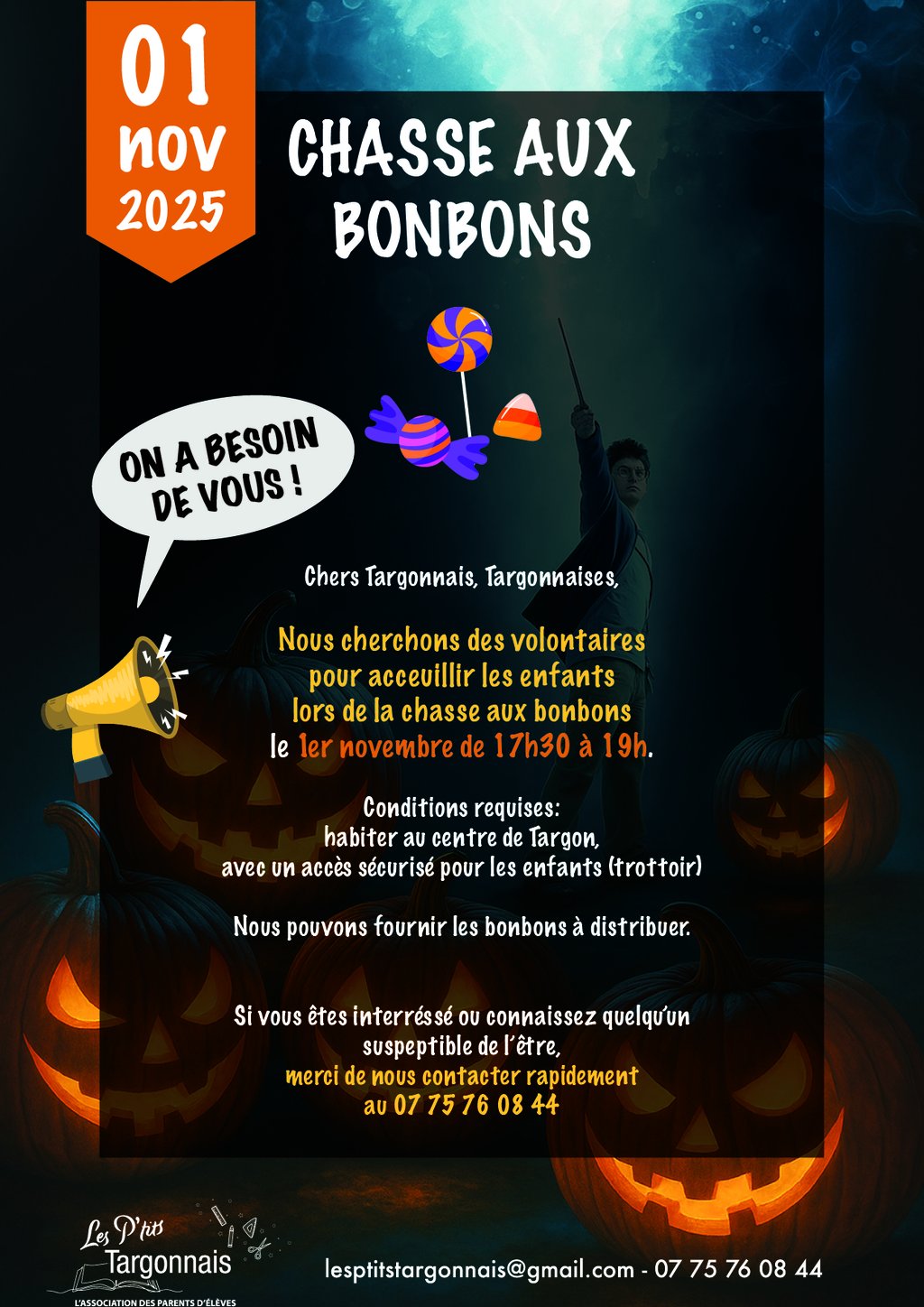 On recherche des personnes habitant dans le centre de Targon, proche salle René Lazare pouvant accueillir les enfants à leur portes entre 17h30 et 19h00 le samedi 1er Novembre pour donner des friandises lors de la chasse aux bonbons.
