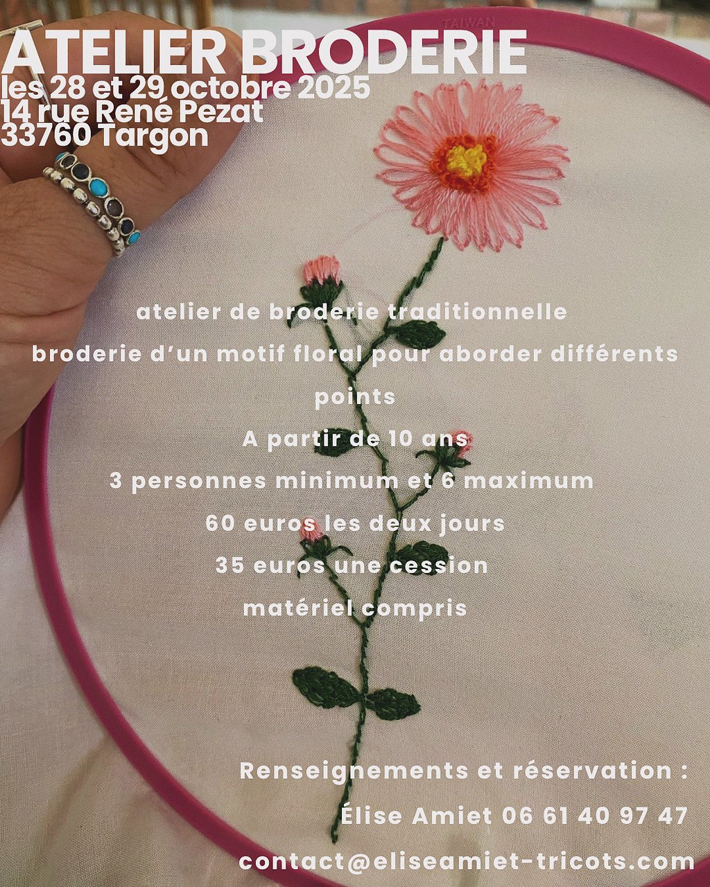 - Atelier broderie 35€ la journée, 60€ les deux jours