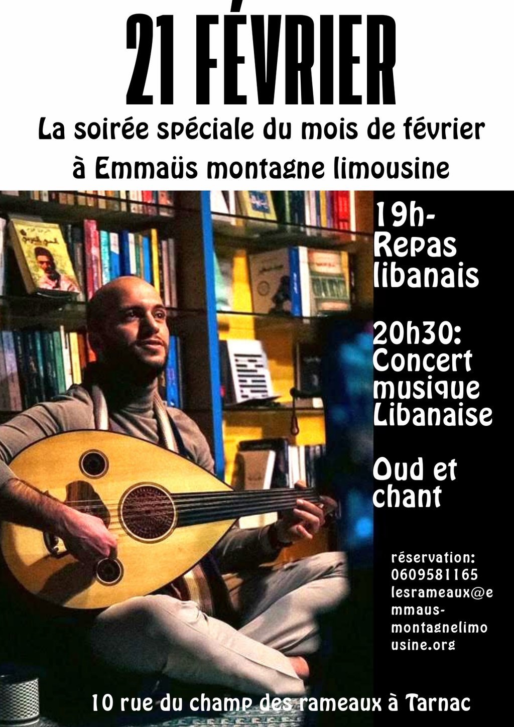 L'équipe de l'Emmaüs de la Montagne Limousine organise une soirée Libanaise, avec à partir de 19h un repas, Mezze libanais suivi d’un concert de Hadi Nasreddine (oud et chant) à 20h30.