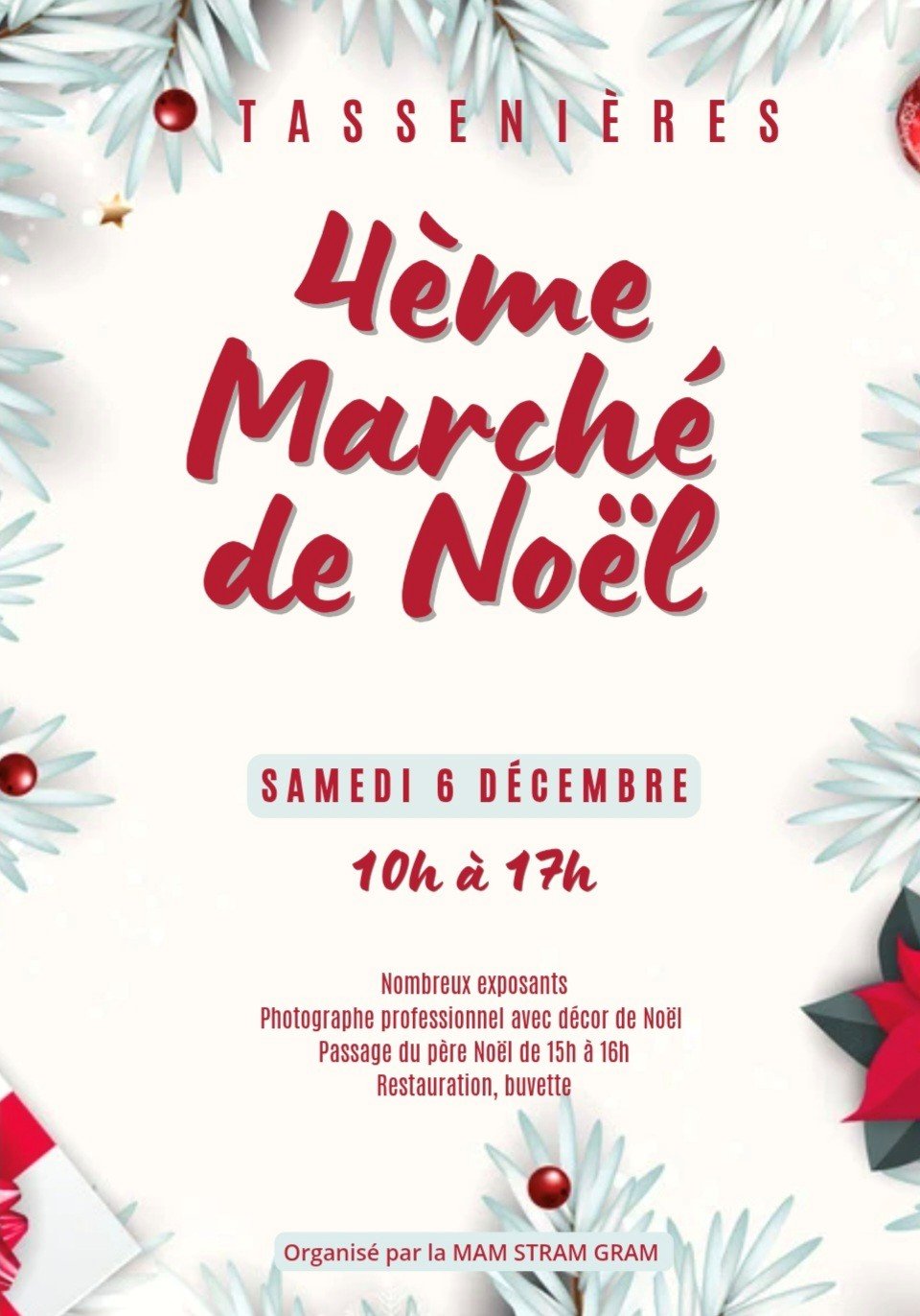 La MAM STRAM GRAM a le plaisir de vous annoncer l’organisation de son 4ème Marché de Noël, qui aura lieu le samedi 6 décembre 2025, de 10h00 à 17h00, à la salle polyvalente de la commune de Tassenières.