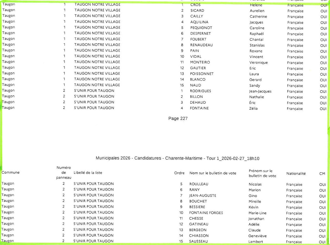 Lors du premier tour de l’élection des conseils municipaux du 15 mars prochain, les électeurs de Taugon auront à choisir entre deux listes validées par la Préfecture :
