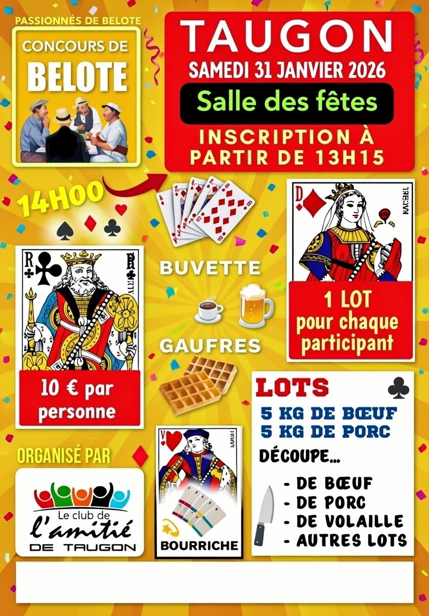 Le club de l’amitié de Taugon organise un concours de belote le 31 janvier 2026 à la salle des fêtes. Les inscriptions débutent à 13 h 15.