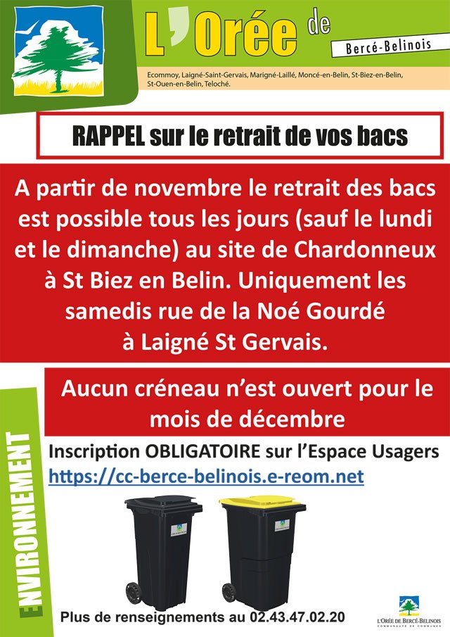 Rappel sur les permanences des sites pour le retrait des bacs.