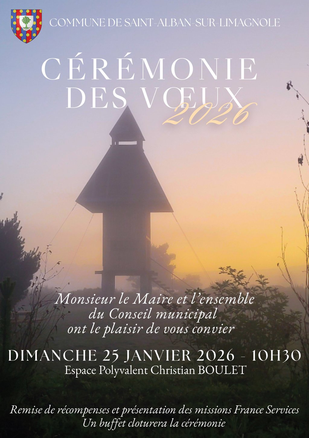 Monsieur le maire et l'ensemble du conseil municipal vous invite à la cérémonie des vœux qui se tiendra le dimanche 25 janvier 2026 à 10h30 à l'Espace Polyvalent Christian Boulet.