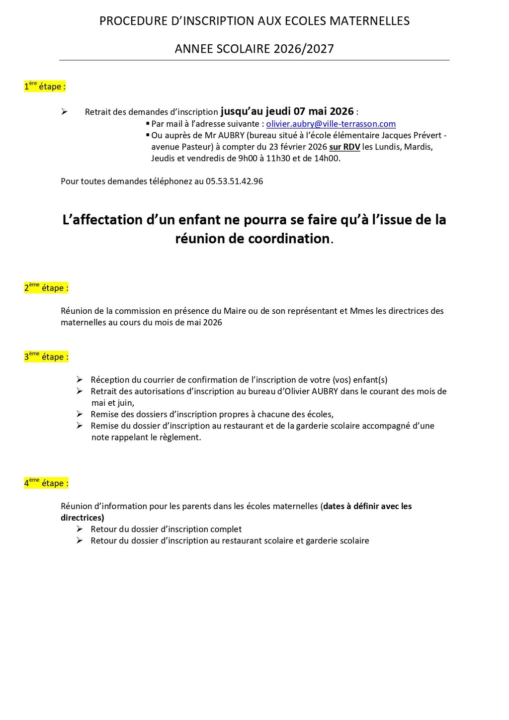 PROCEDURE D’INSCRIPTION AUX ECOLES MATERNELLES ANNEE SCOLAIRE 2026/2027