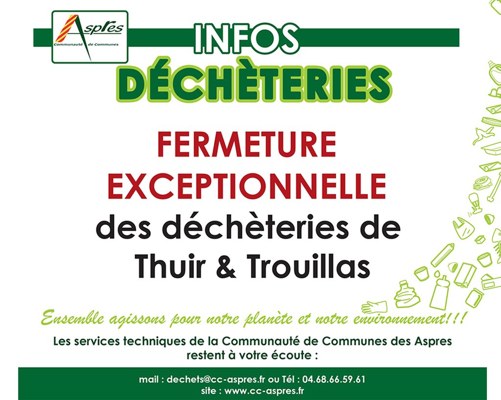 FERMETURES EXCEPTIONNELLES DES DÉCHÈTERIES DE THUIR ET TROUILLAS