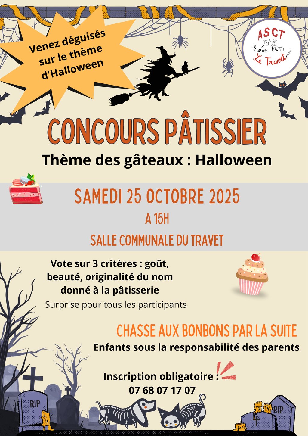 L'ASCT organise un concours pâtissier pour les petits et grands le samedi 25 octobre 2025 à 15h à la salle communale du Travet, sur le thème Halloween !
