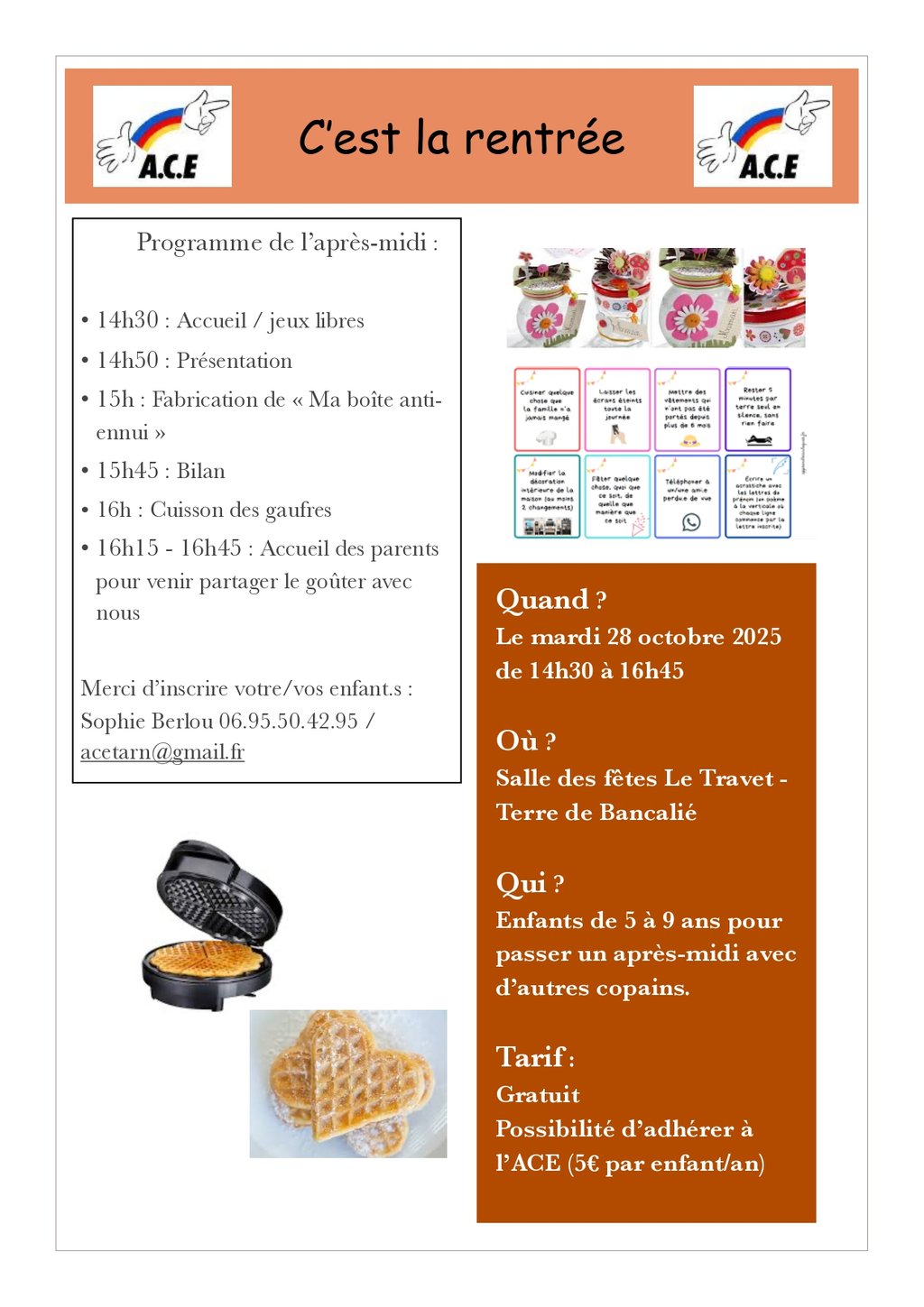 Tarif : Gratuit ou possibilité d'adhérer à l'ACE (5€ par enfant/an)