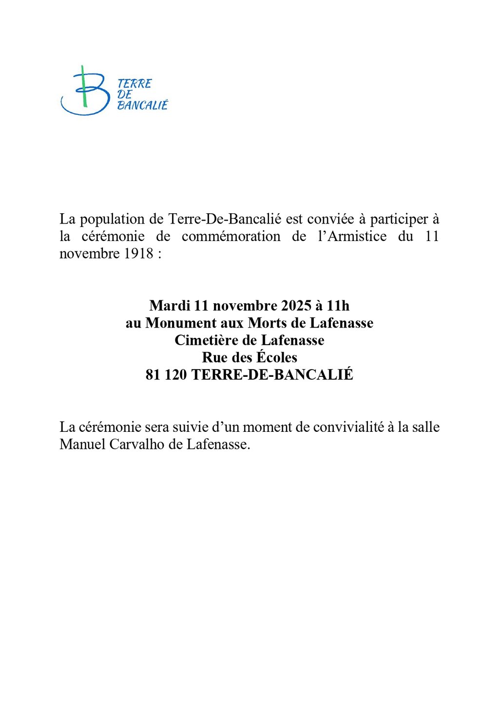 La population de Terre-De-Bancalié est conviée à participer à la cérémonie de commémoration de l'Armistice du 11 novembre 1918 :