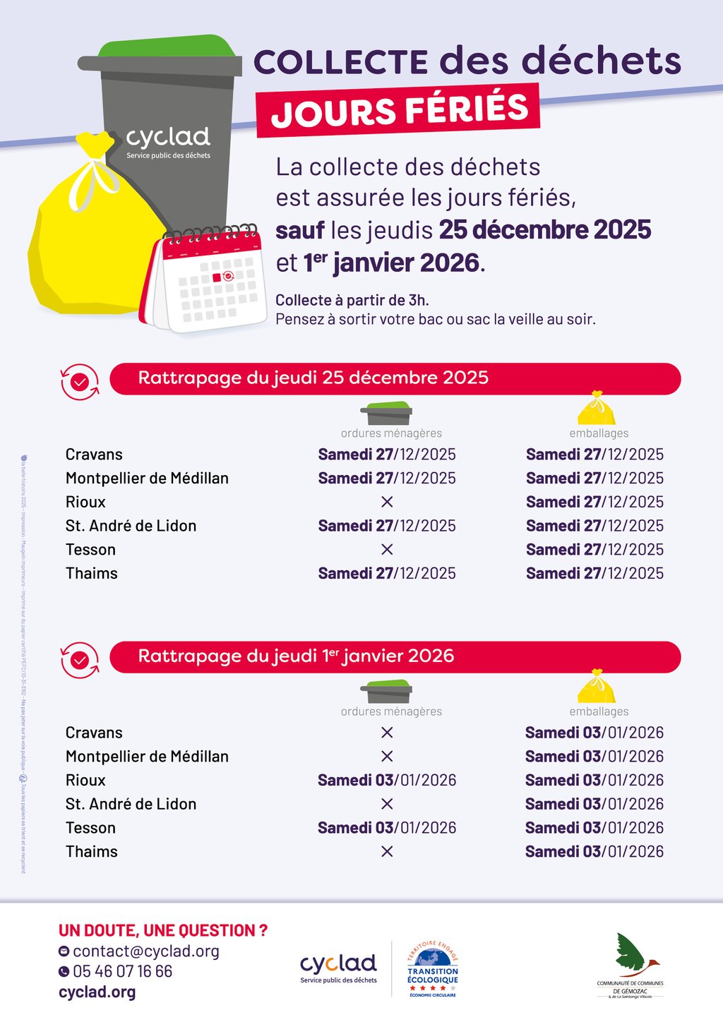La collecte des déchets est assurée les jours fériés, sauf les jeudis 25 décembre 2025 et 1er janvier 2026.