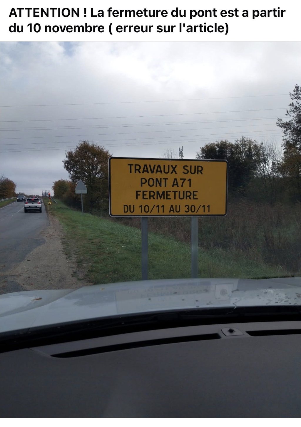 Le pont qui traverse l'A71 à Theillay fermé du 12 au 30 novembre en raison de travaux https://www.leberry.fr/theillay-41300/actualites/le-pont-qui-traverse-l-a71-a-theillay-ferme-jusqu-au-30-novembre-en-raison-de-travaux_14775392/