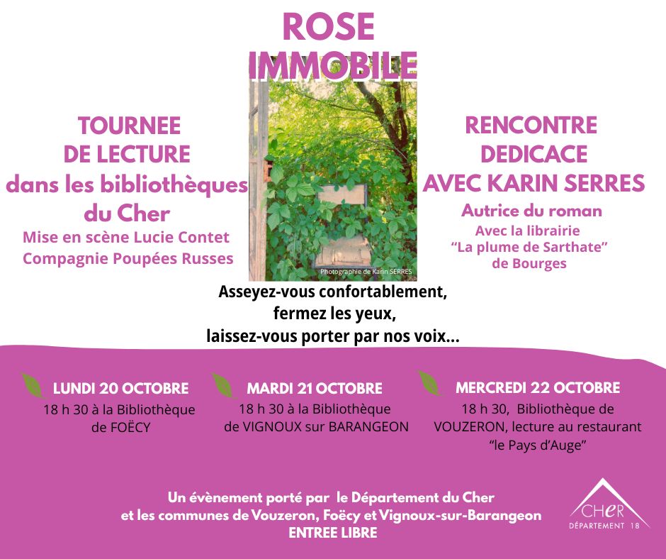 La médiathèque du Cher organise en partenariat avec les bibliothèques de Vouzeron, Vignoux sur Barangeon et Foëcy, 3 soirées de lecture à voix haute autour du dernier roman de Karine Serres, ROSE IMMOBILE.
