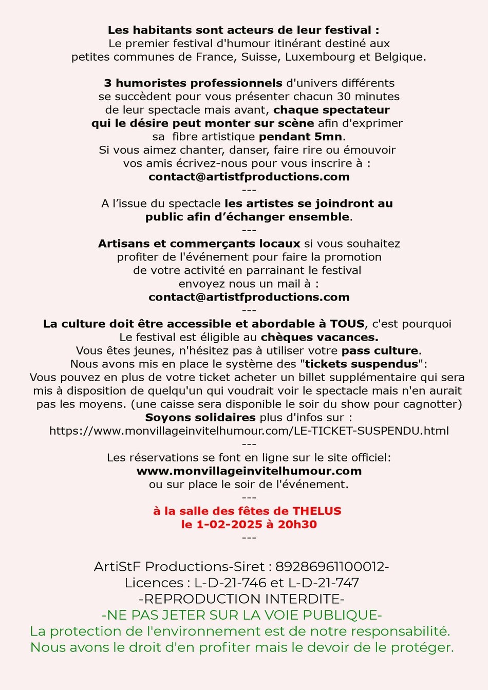 🎫Billetterie et renseignements : www.monvillageinvitelhumour.com/Thelus.html