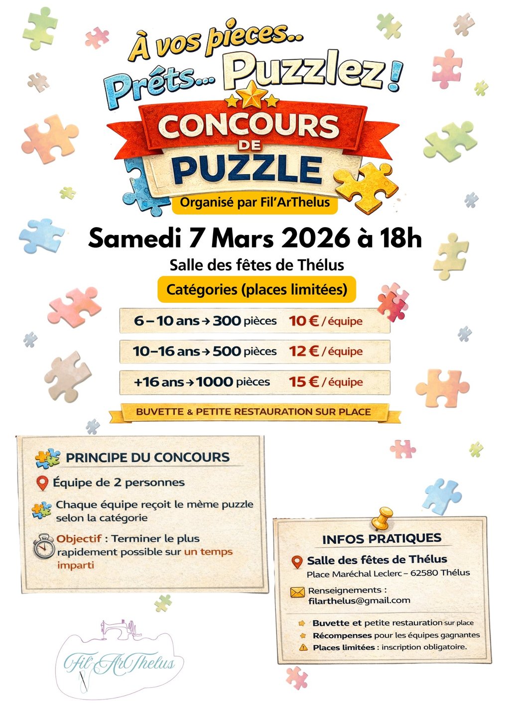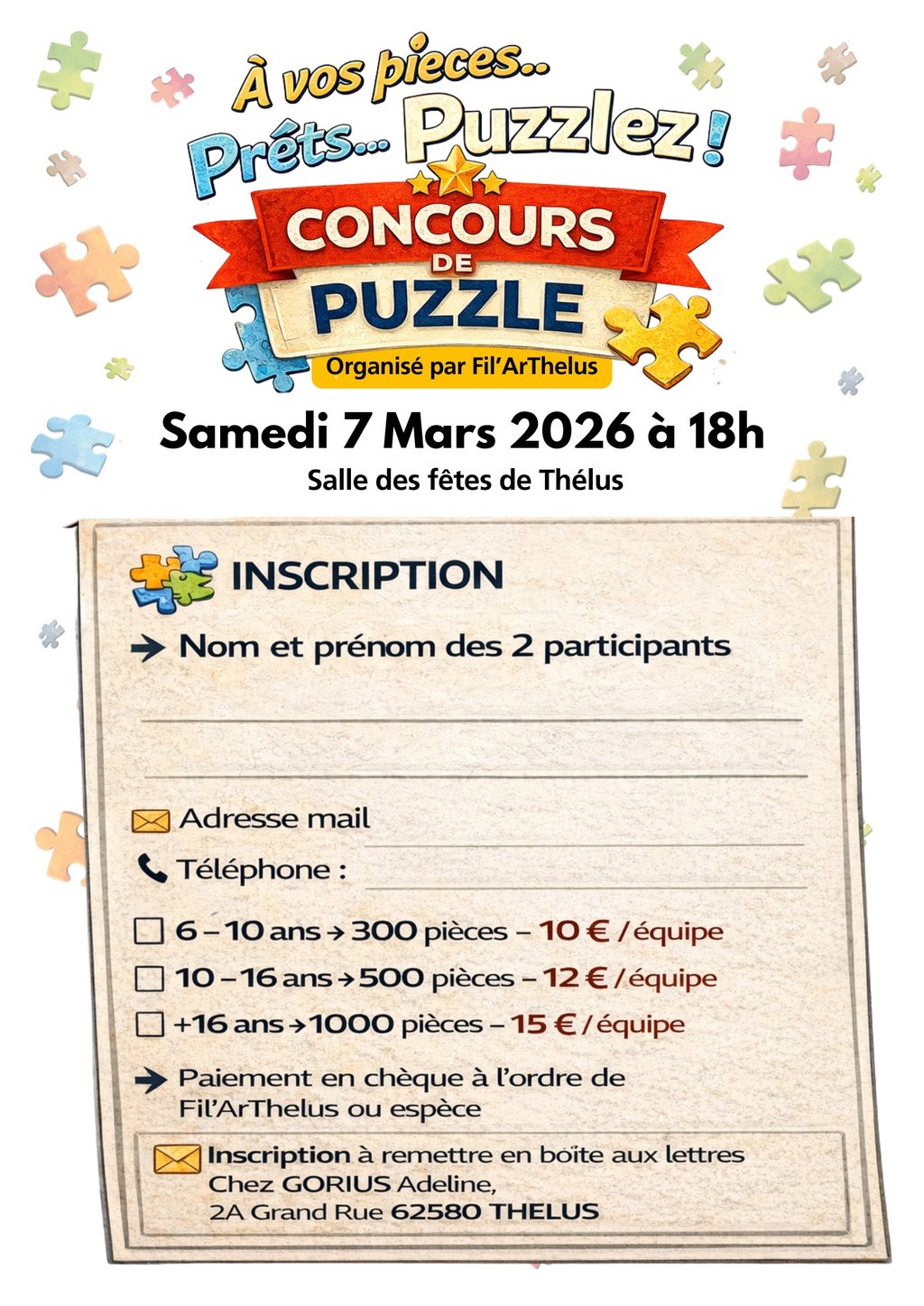 Nous sommes très heureux de vous inviter à notre premier concours de puzzle, une soirée conviviale et familiale organisée à Thélus !
