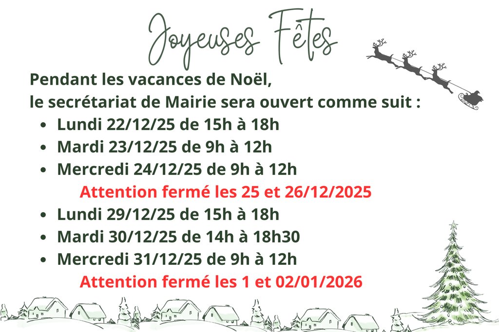 Horaires du secrétariat de mairie du 22/12/25 au 02/01/26 inclus.