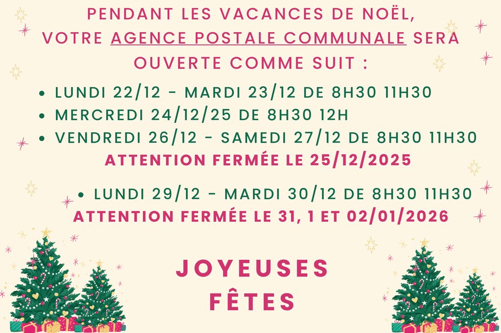 Horaires de l'Agence Postale Communale du 22/12/25 au 03/01/26 inclus.
