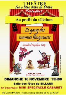 Représentation théâtrale au profit du téléthon de la pièce "Le gang des mamies flingueuses" d'Angélique Sutty par la troupe les p'tites têtes de litotes. En ouverture mini spectacle cabaret.