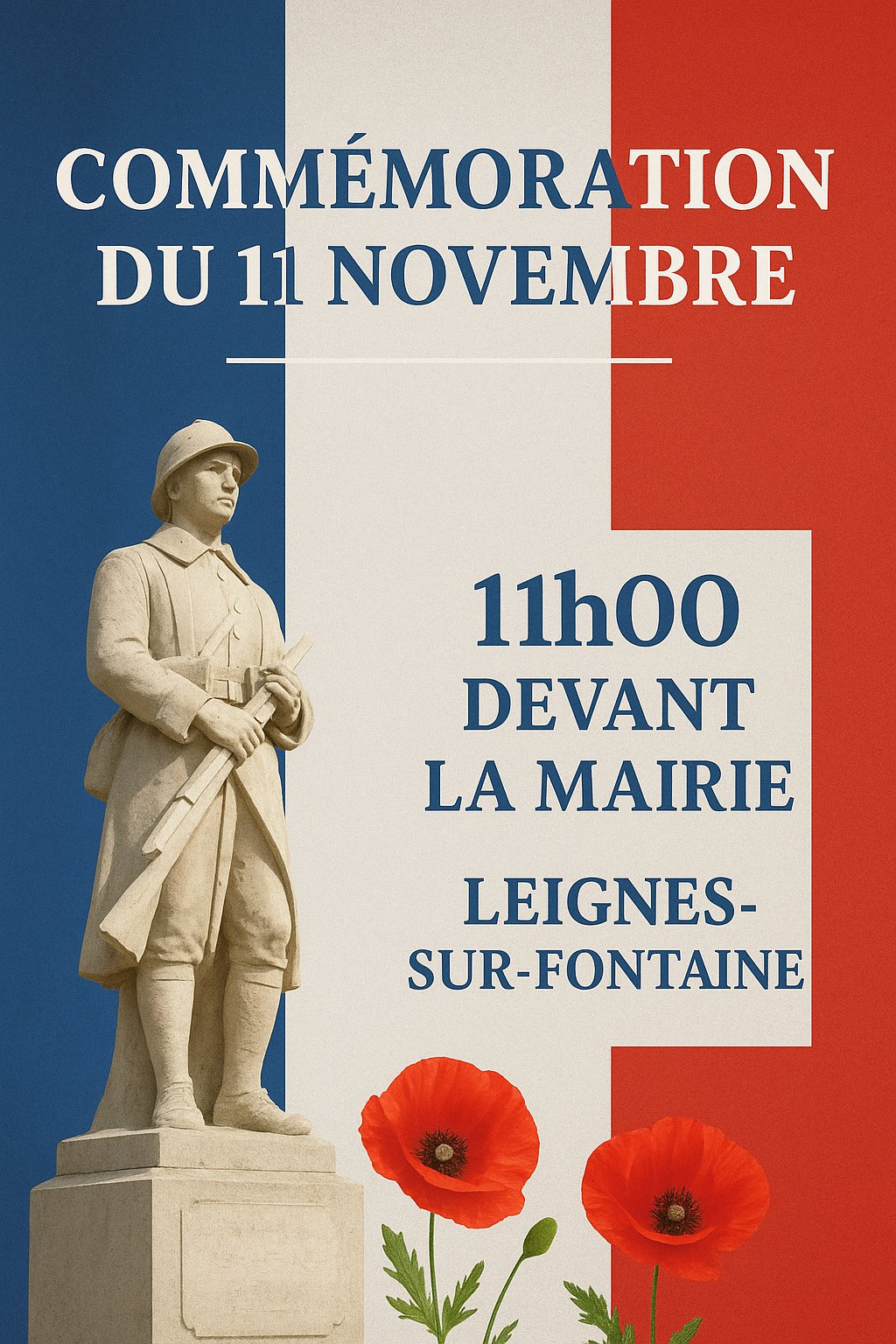 La commémoration aura lieu le mardi 11 novembre à 11 h 00 devant la Mairie de Leignes sur Fontaine.