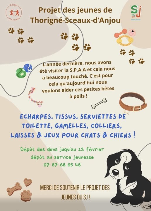 AprĂšs une rencontre avec la SPA, les jeunes du service Jeunesse ThorignĂ© Sceaux d'Anjou lancent une collecte de dons dâobjets pour les chiens et chats.