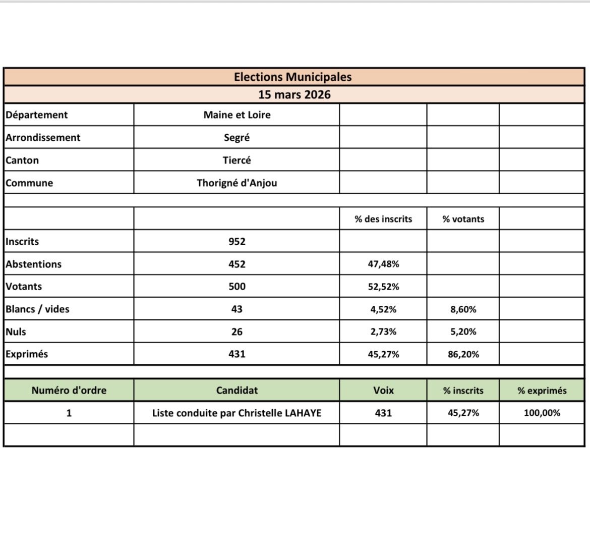Veuillez trouver ci-joint le tableau récapitulatif du résultat des élections municipales du 15 mars 2026.
