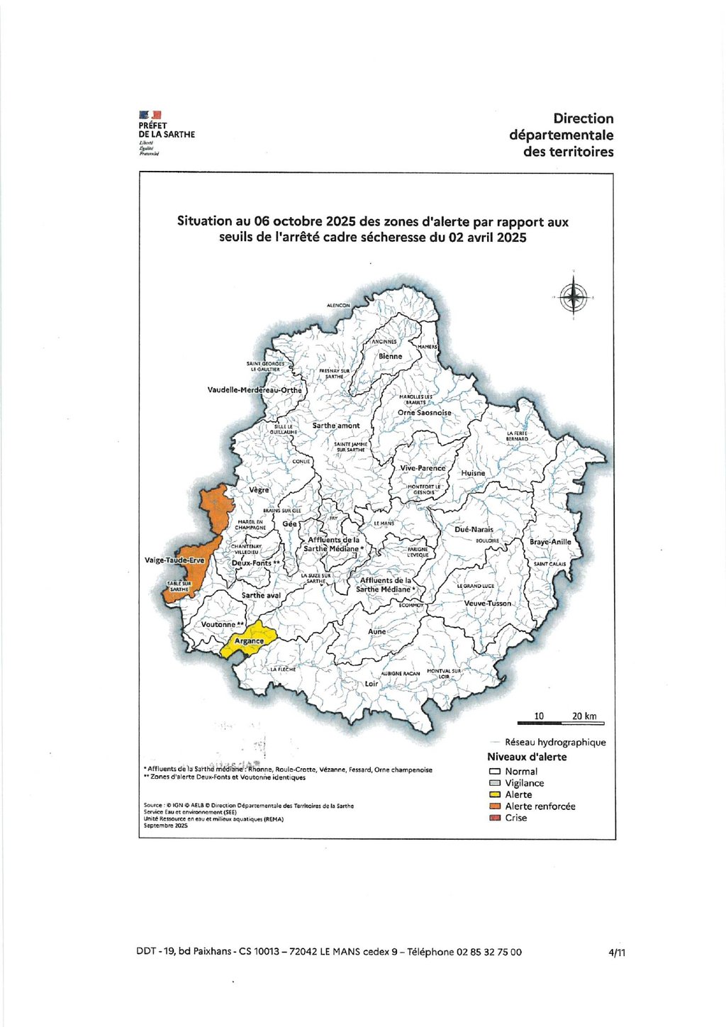 Le préfet de la Sarthe a pris un arrêté préfectoral "sécheresse" le 09/10/ 2025 plaçant certains bassins sous le régime de limitation des usages de l'eau.