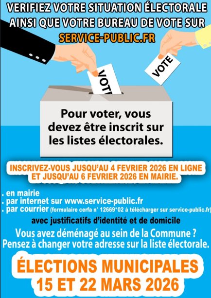 Inscription sur liste électorale jusqu'au 4 février 2026 en ligne, et jusqu'au 6 février 2026 en mairie !