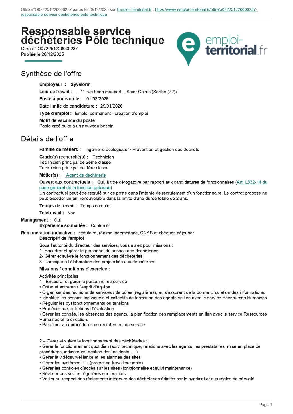 OFFRE D'EMPLOI RESPONSABLE DÉCHÈTERIES