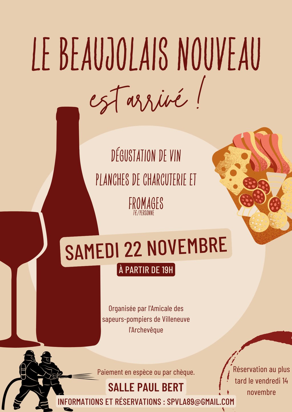 Les pompiers de Villeneuve l'Archevêque vous proposent de se retrouver à la salle Paul Bert pour dégustation du Beaujolais Nouveau, inscrivez-vous dès aujourd'hui