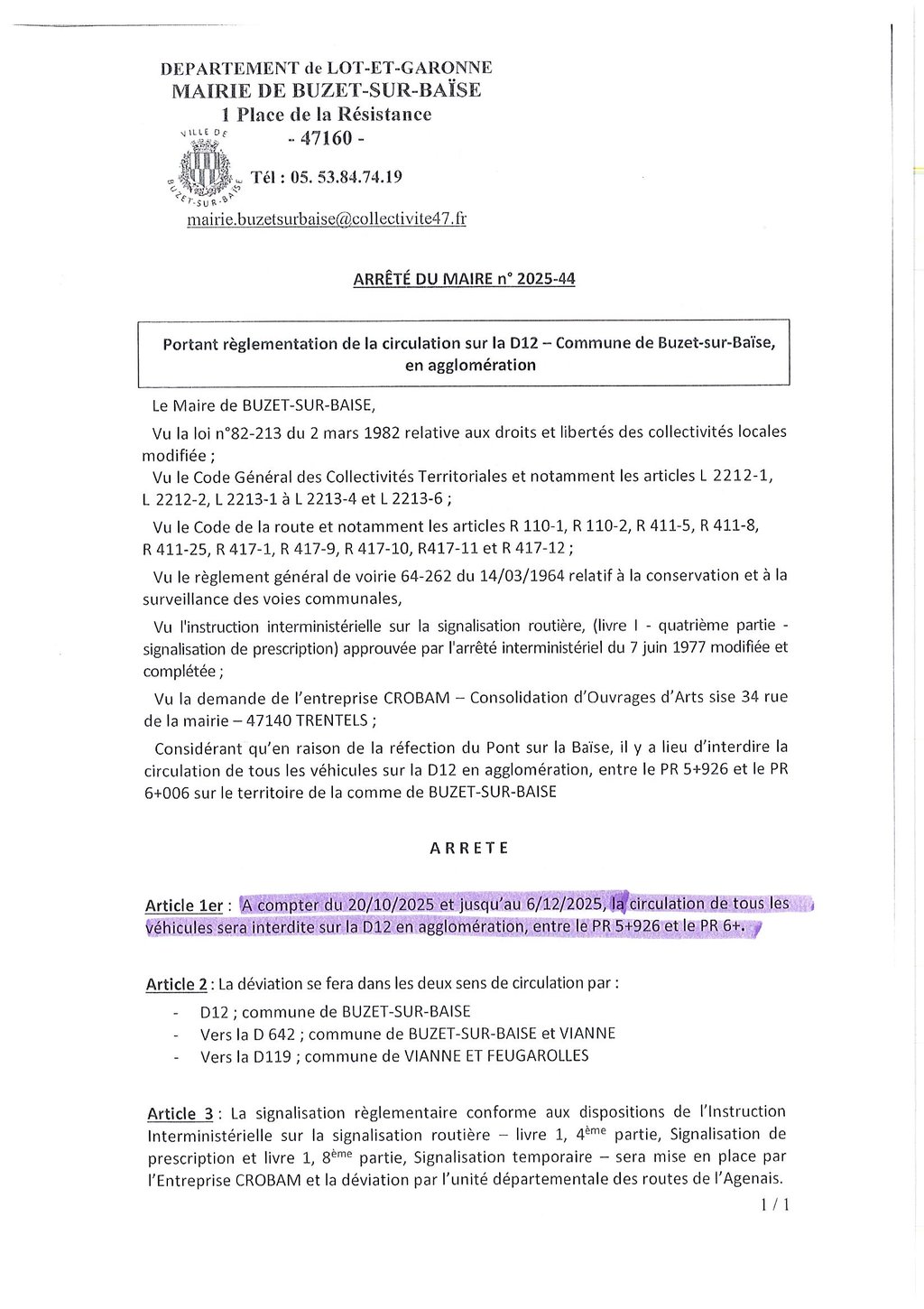 Un arrêté municipal (n°2025-44) réglemente temporairement la circulation sur la D122 en agglomération.