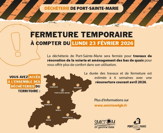 LA DÉCHÈTERIE DE PORT-SAINTE-MARIE FERME TEMPORAIREMENT À PARTIR DU LUNDI 23 FÉVRIER 2026