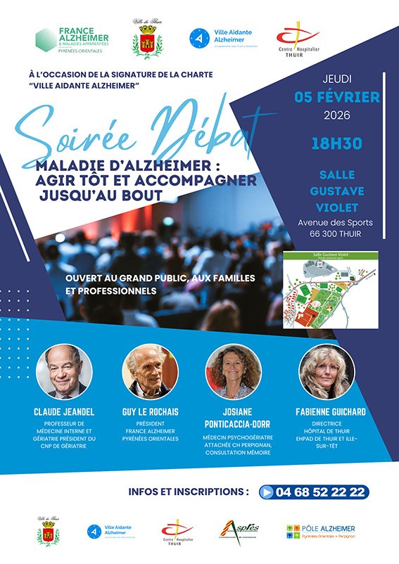 Le Centre Hospitalier de Thuir, en partenariat avec France Alzheimer et la Communauté de communes des Aspres, organise une soirée débat dans le cadre de la signature de la Charte Ville Aidante Alzheimer avec la commune de Thuir.