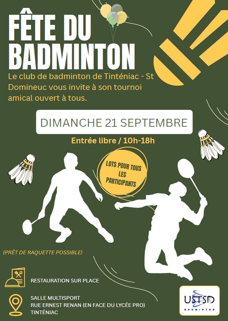 Le club de badminton de l'Union Sportive Tinténiac - Saint-Domineuc vous invite à son tournoi amical :